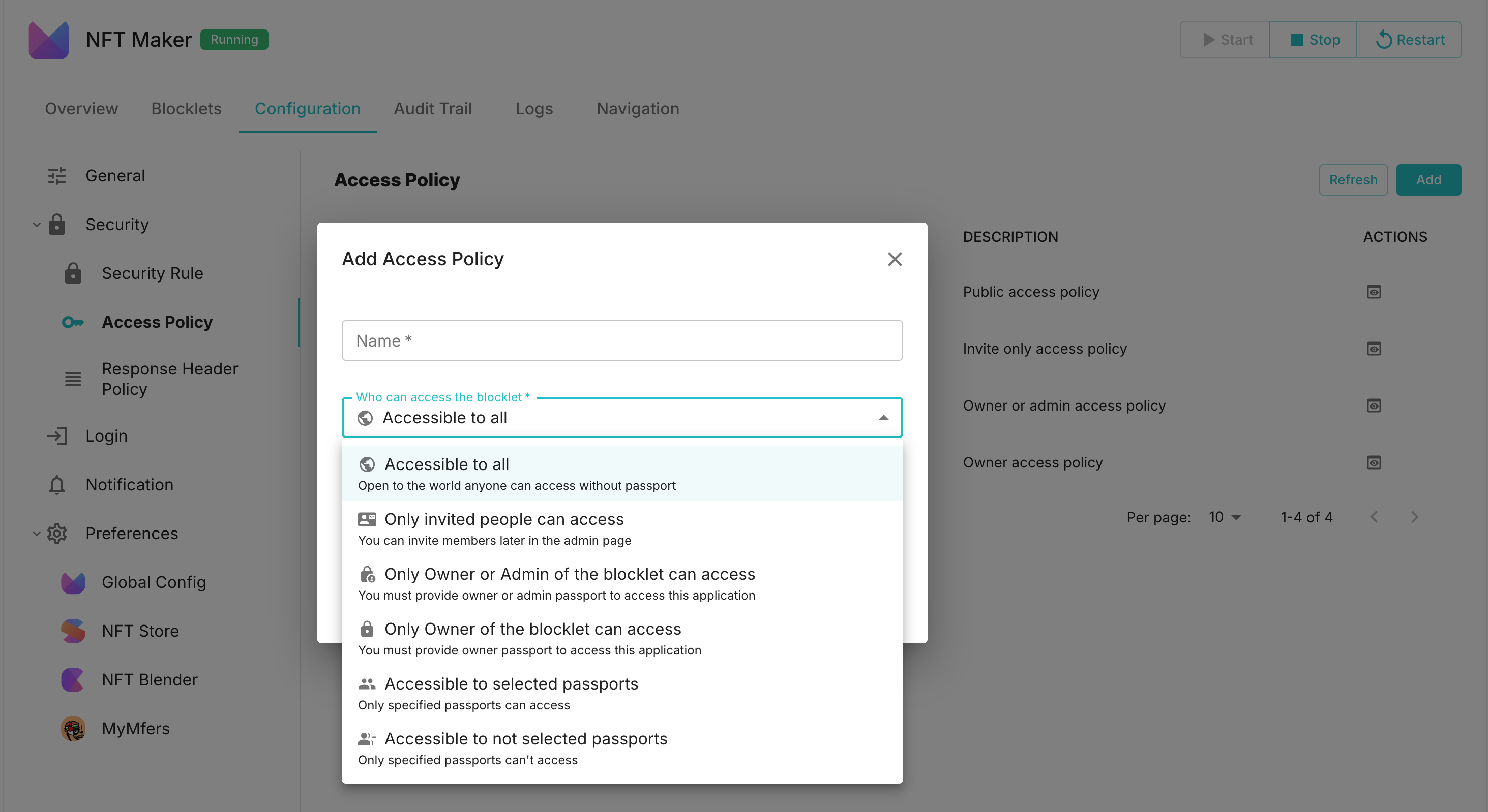 Access policies can control who can access the application based on whether the user is logged in and their role, with specific options illustrated in the image below (if certain terms are unclear, you can refer to User and Passport):