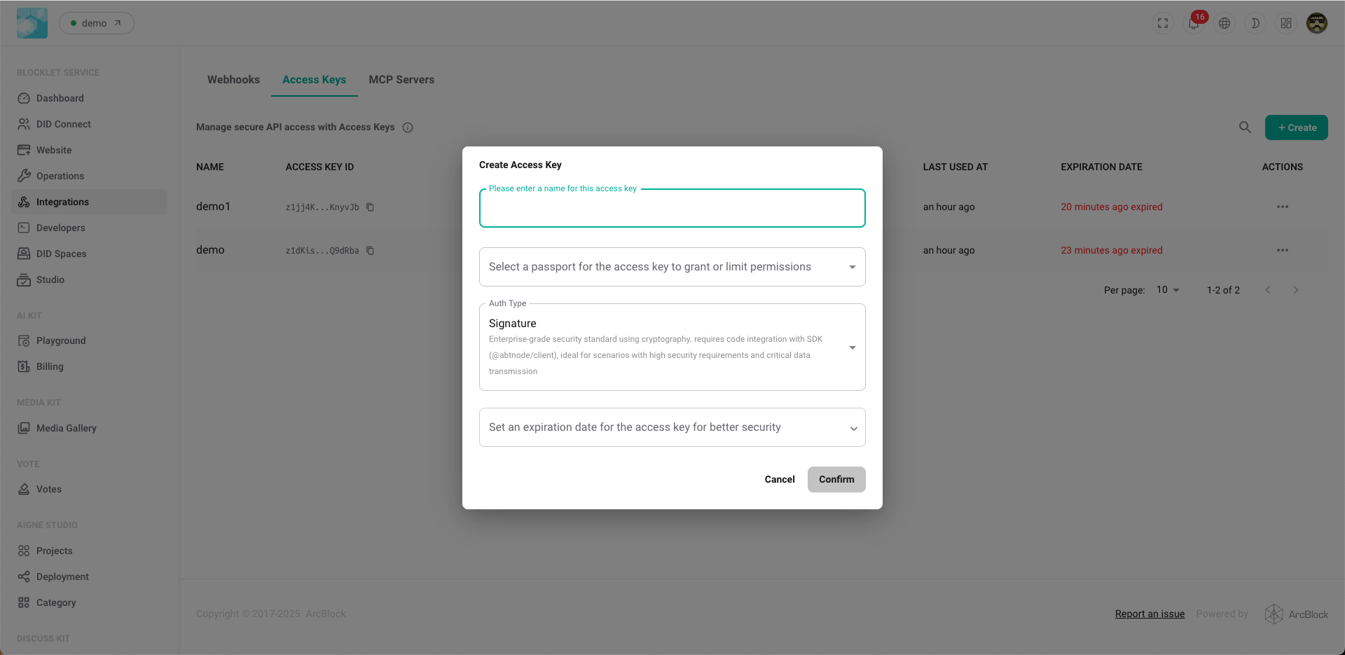 • Access Key 类型: Blocklet 提供两种安全级别的 Access Key: