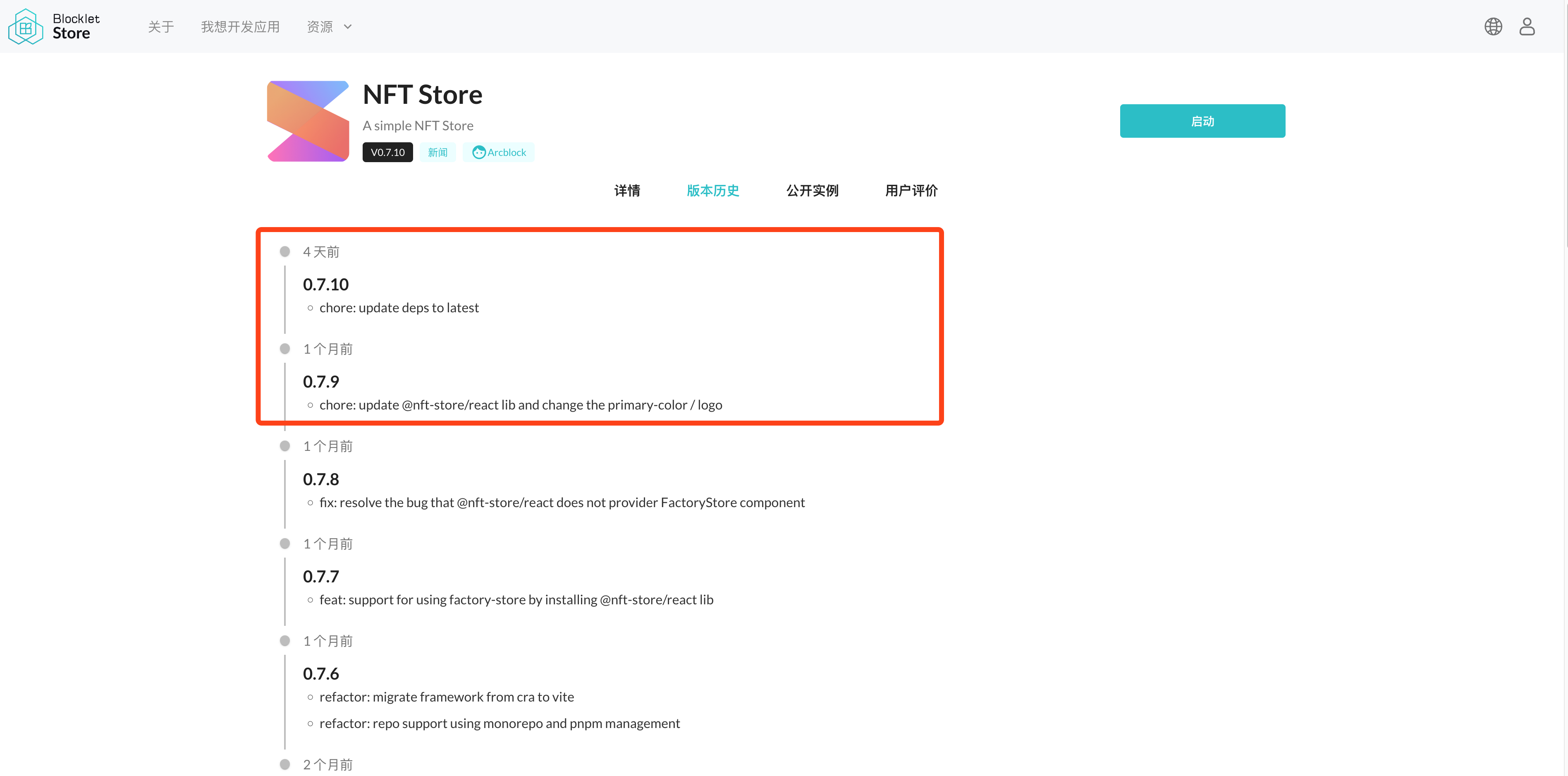 - chore: update @nft-store/react lib and change the primary-color / logo打包发布到 blocklet store 之后,你可以在 blocklet 详情页(查看示例)面看到你的变更记录。
