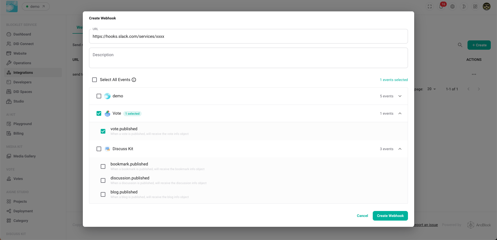• 完成创建后,当您的投票 Blocklet 中有新的投票发布(即 vote.published 事件被触发)时,Blocklet Service 会自动向您配置的 Slack URL 发送一个 HTTP 请求。