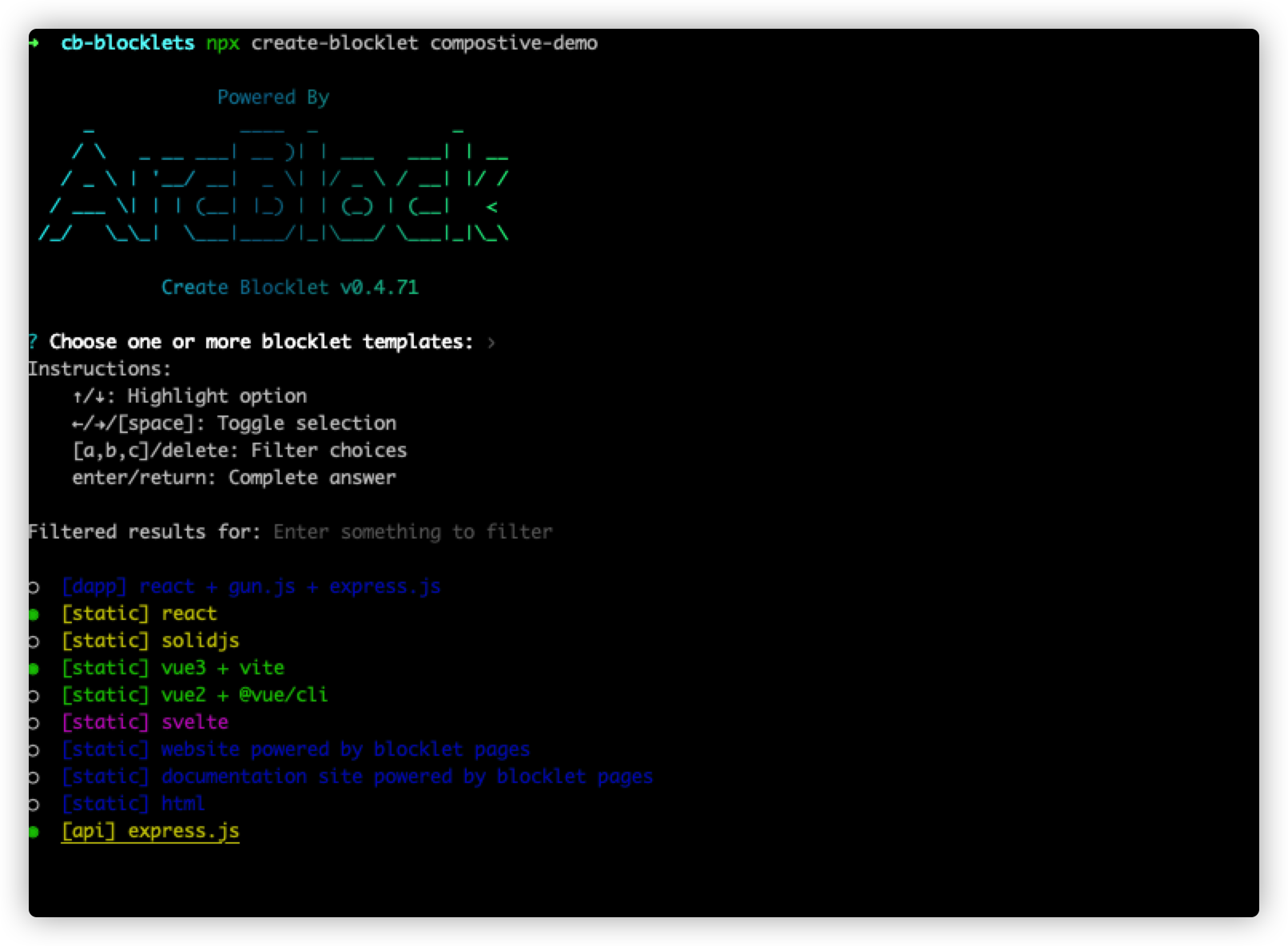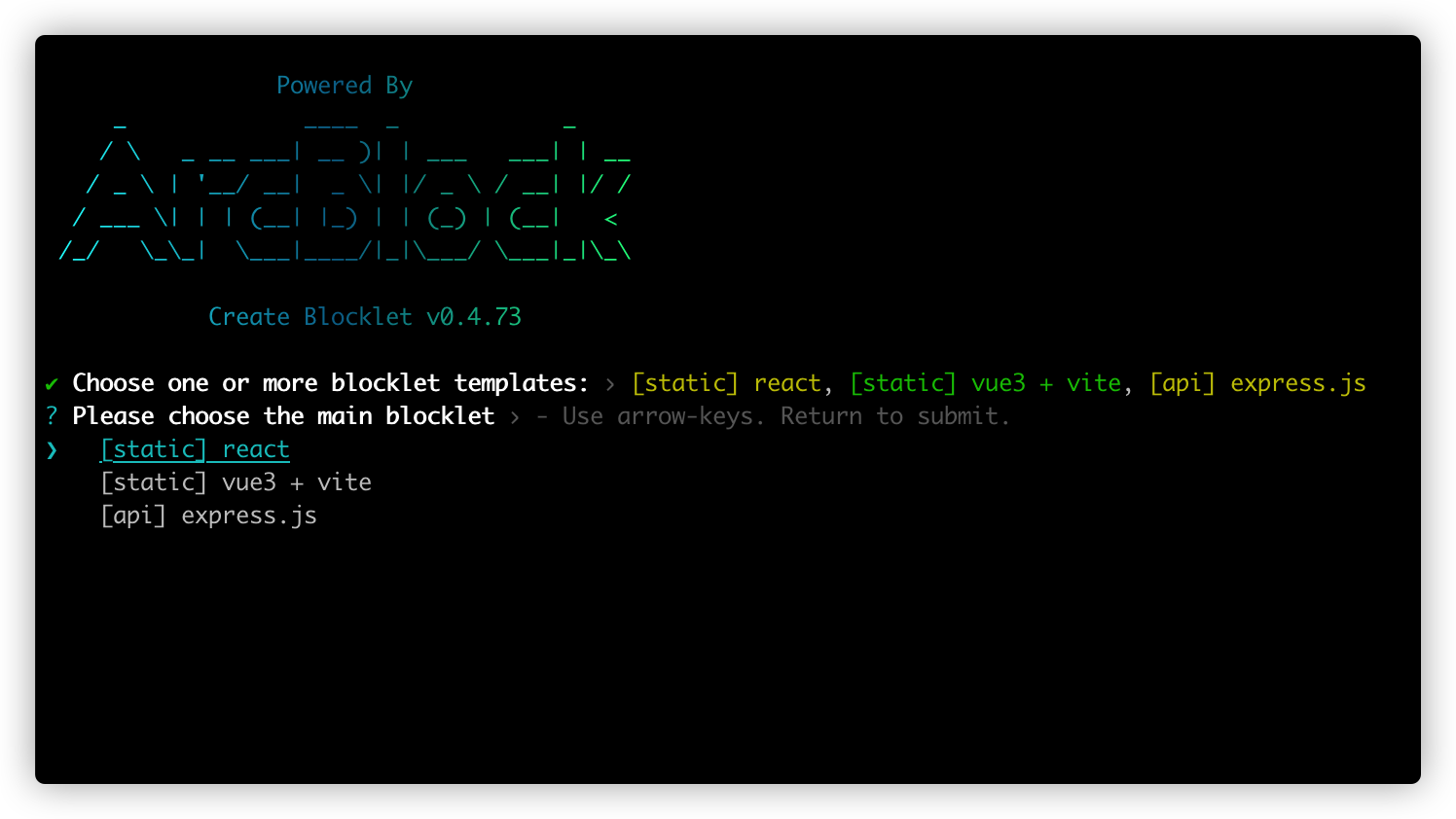 After executing the create-blocklet command in the terminal and entering the project name to enter the template selection phase, we choose multiple templates, here we choose react-dapp vue-static express (with the ability of the blocklet platform, we can combine different front-end frameworks together).