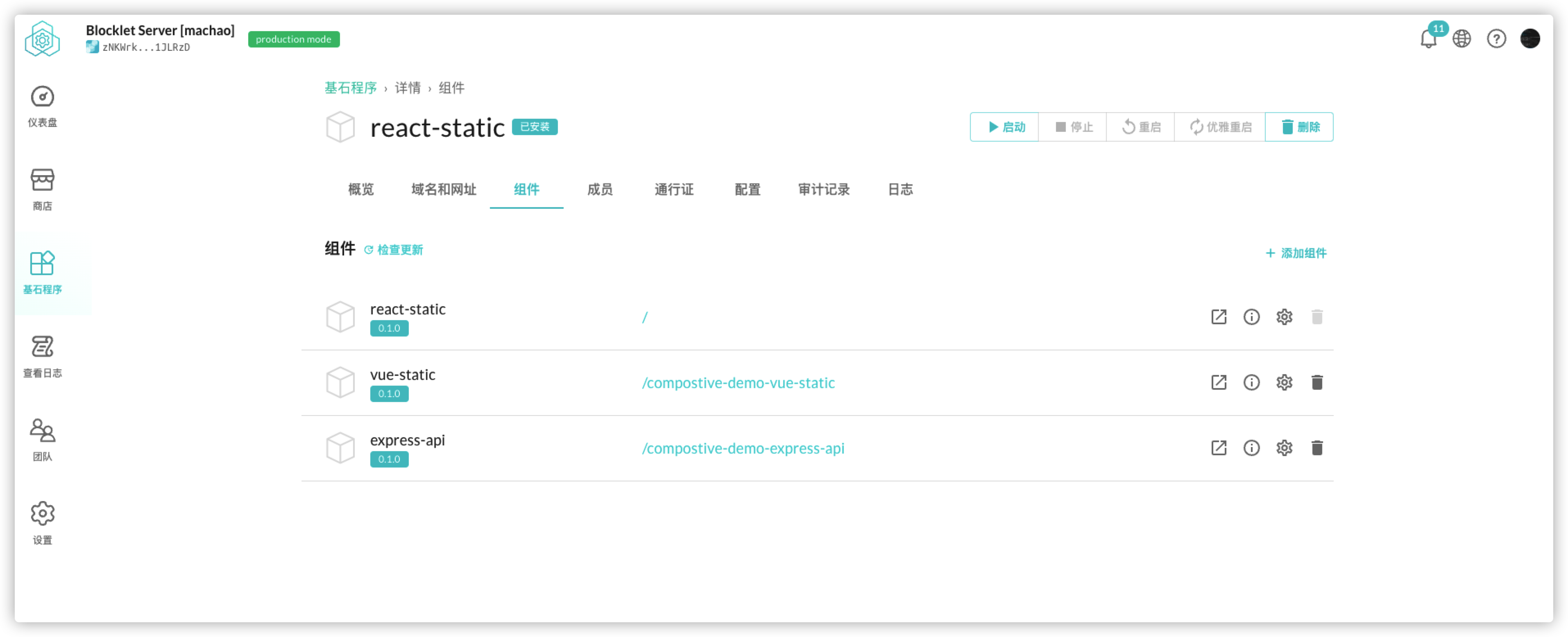 In the administration page of your local blocklet-server instance, we can visualize the mounting relationship between blocklets: react-static as the main app, vue-static, express-api as children mounted on the main app
