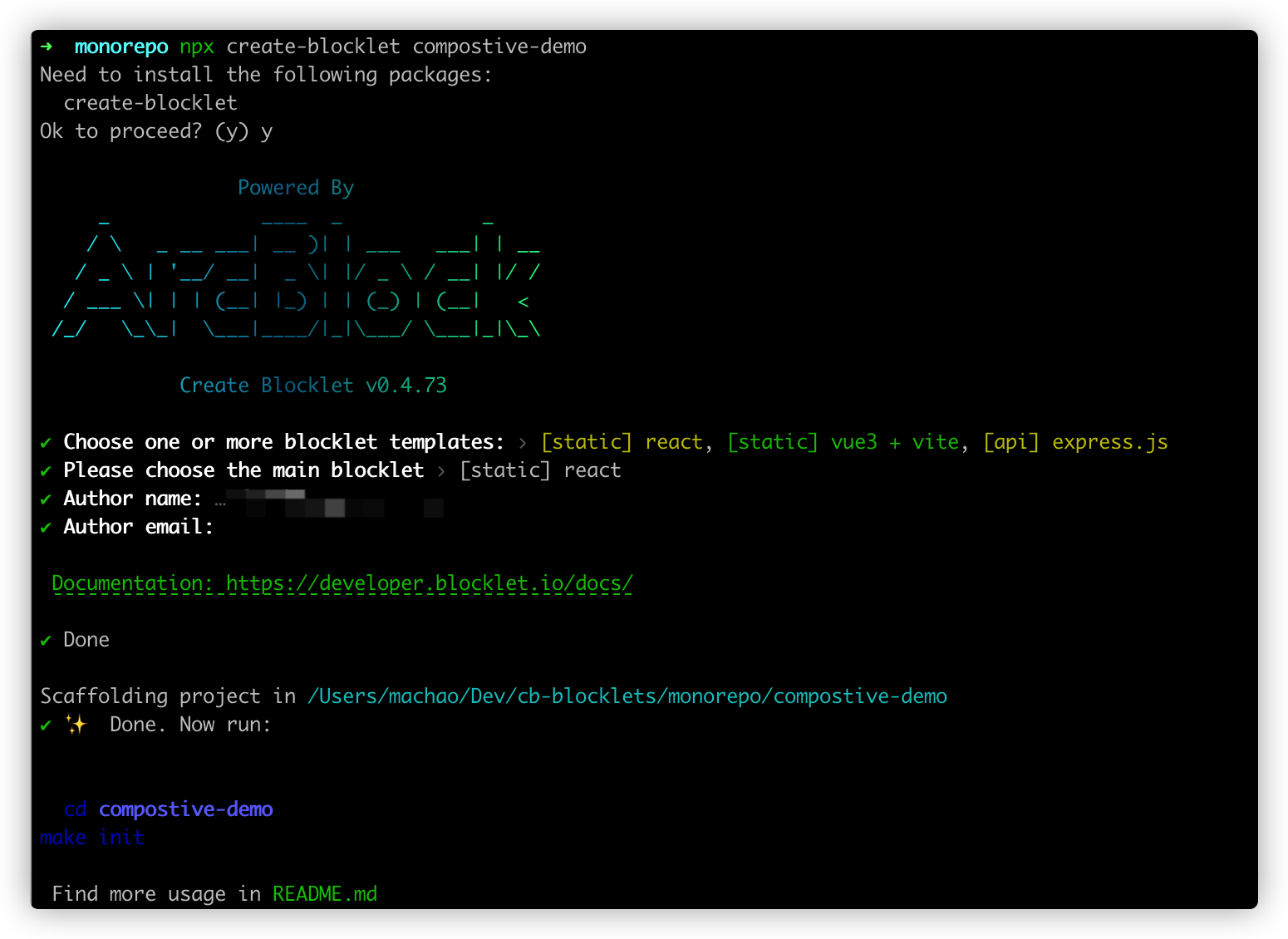 Enter the email, author, and other information and press enter to confirm. After waiting for the file to be created, we get a Monorepo type project directory containing the three Blocklets I chose in the previous step.
