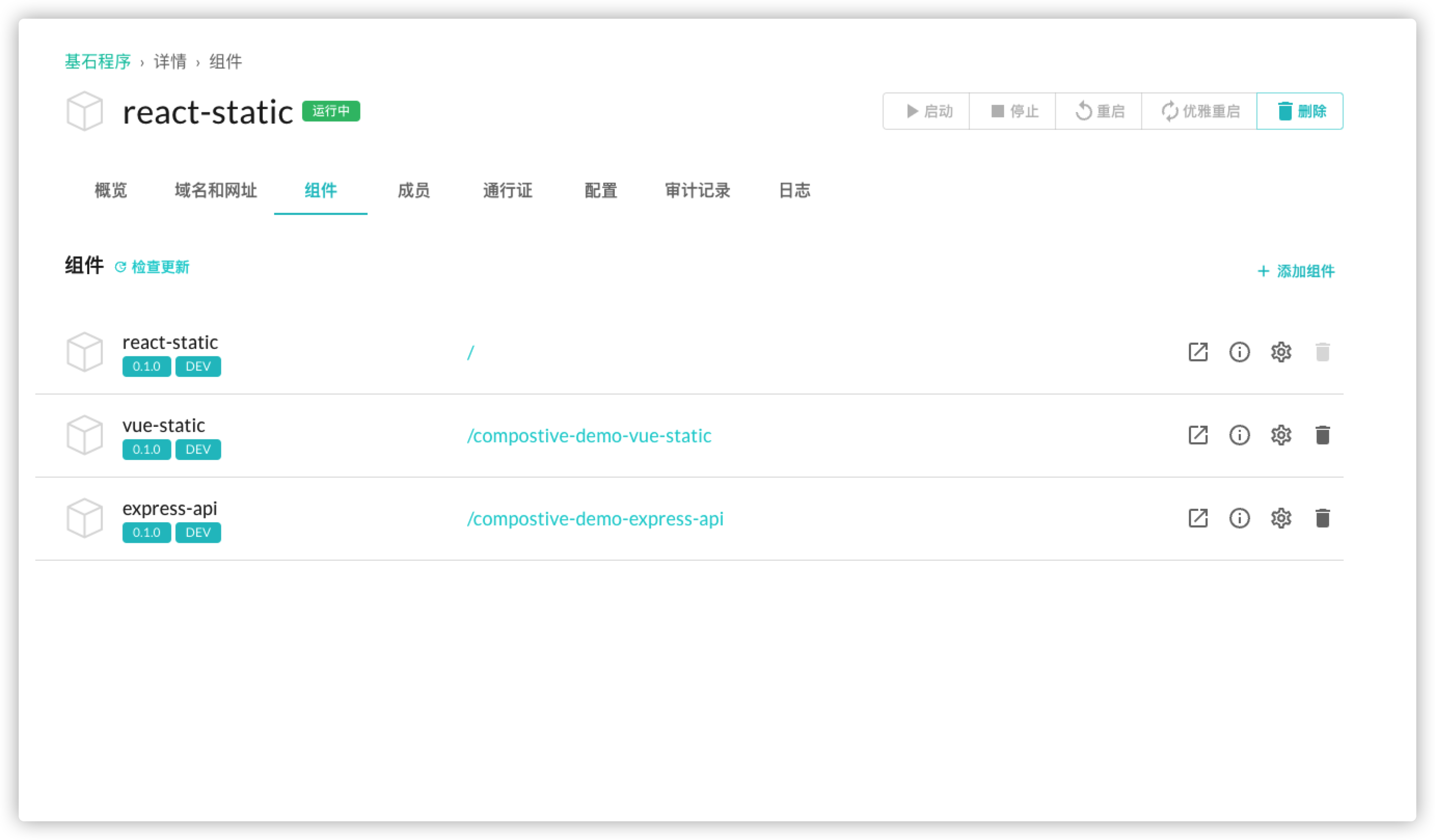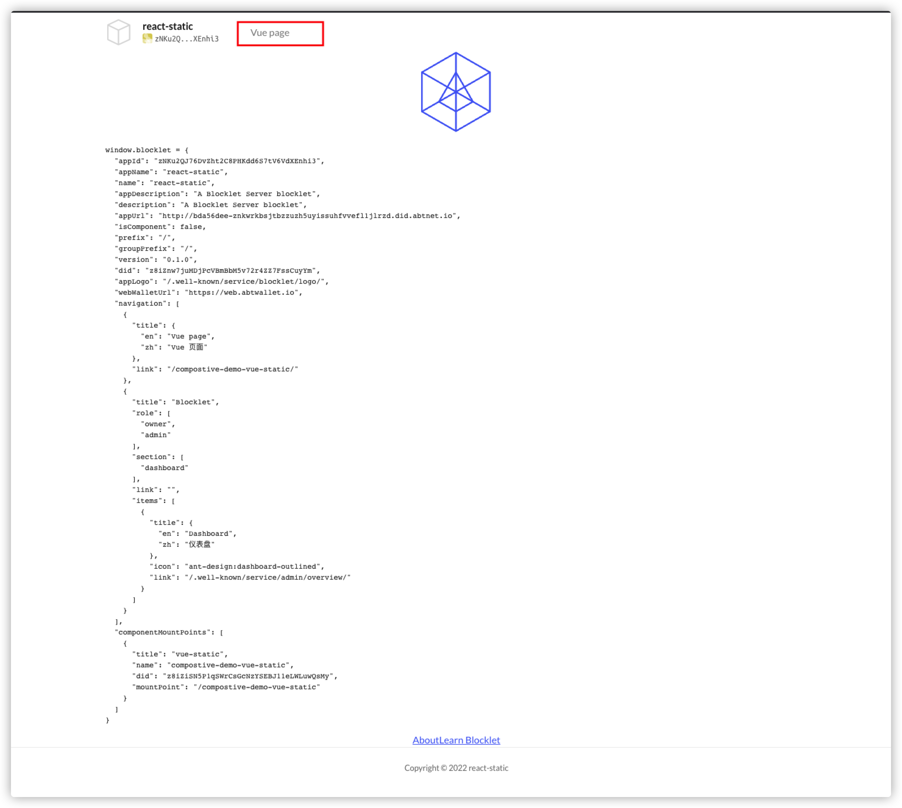 link: /compostive-demo-vue-staticRemember the [unified configuration and UI] we mentioned at the beginning of the article (what is a combined app)? We do this by using a unified UI component in each application's page for the configuration in navigation, which we show in a react type application using @blocklet/ui-react.