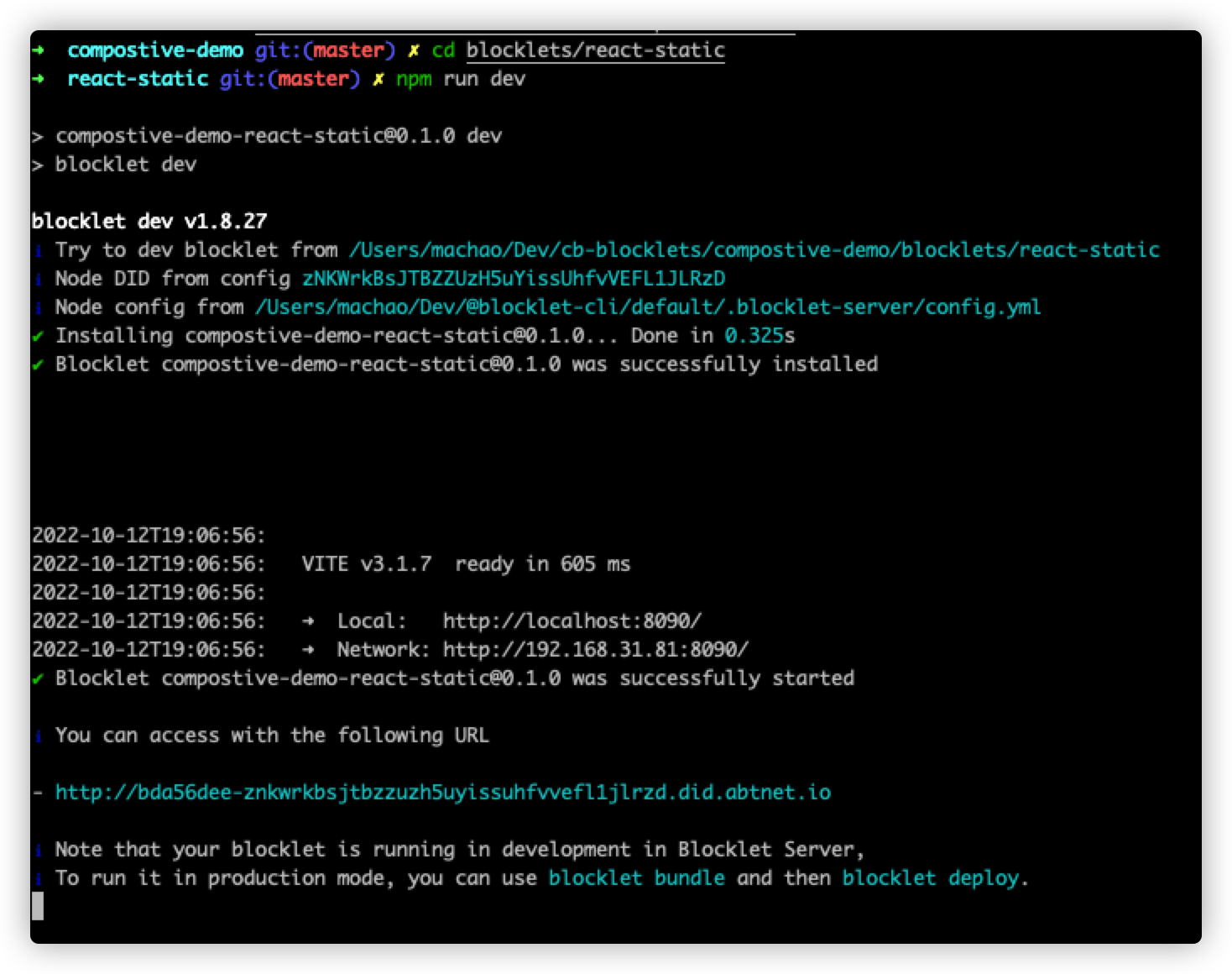 When development is complete, you can deploy the application to the blocklet server using the blocklet deploy command;