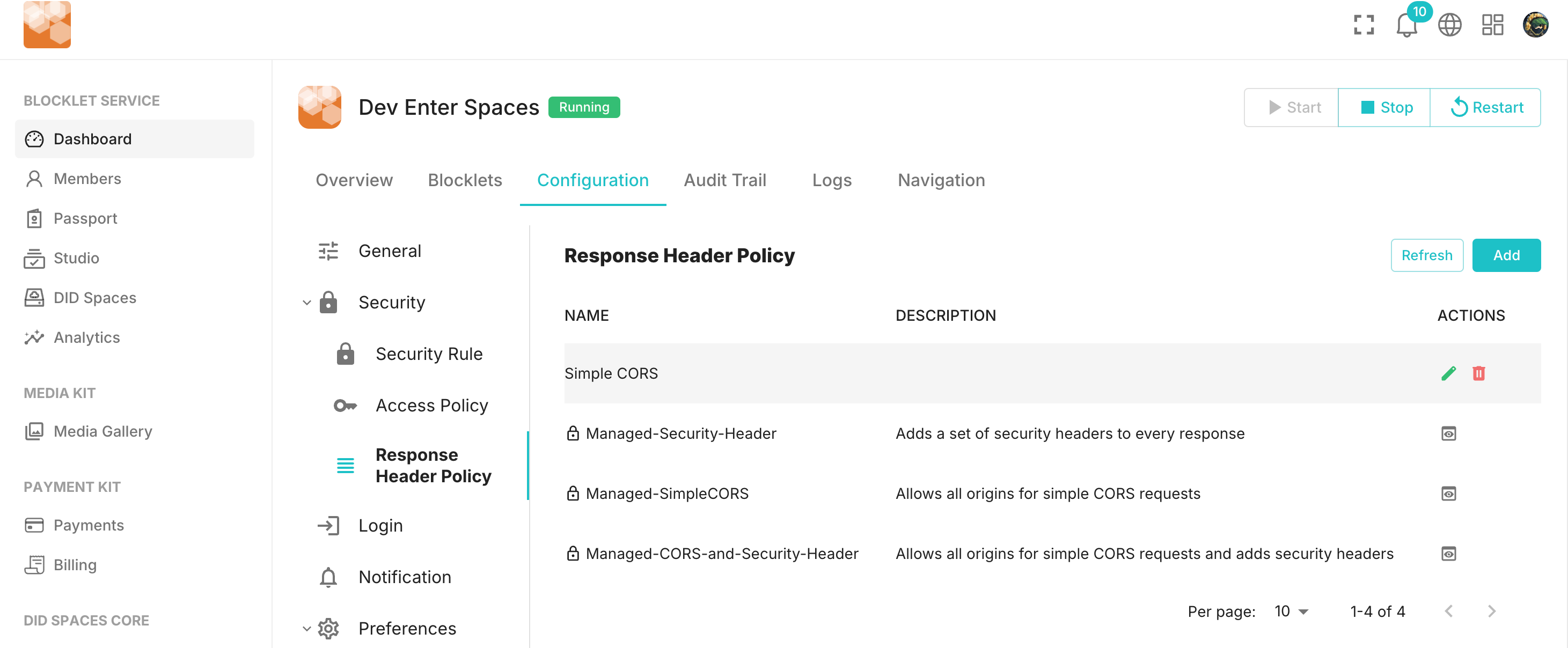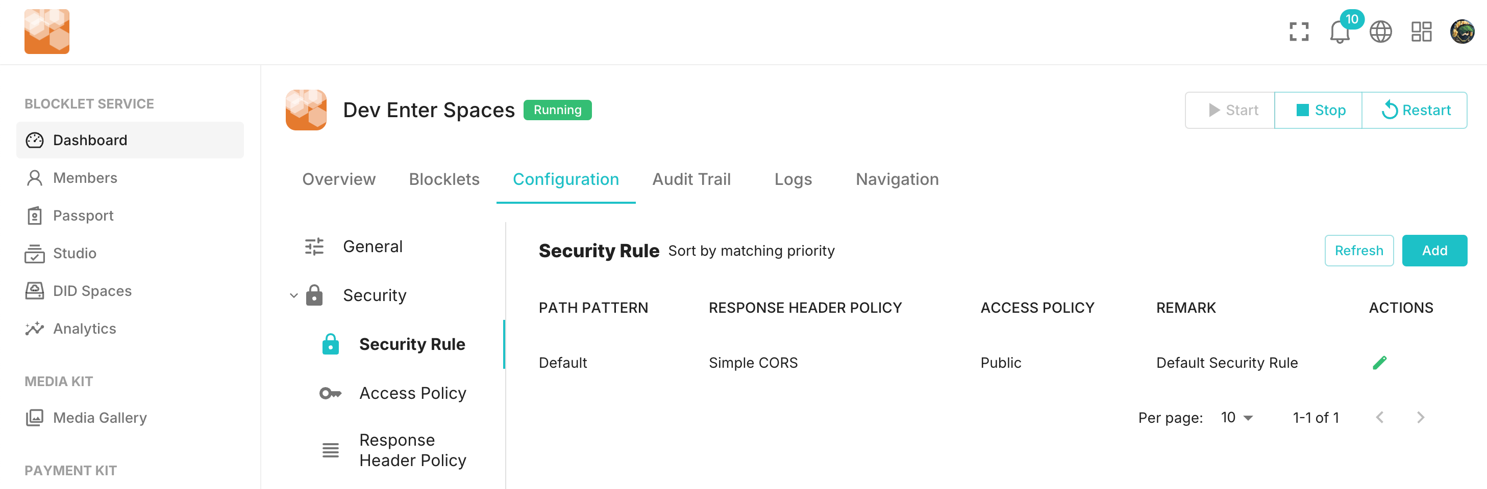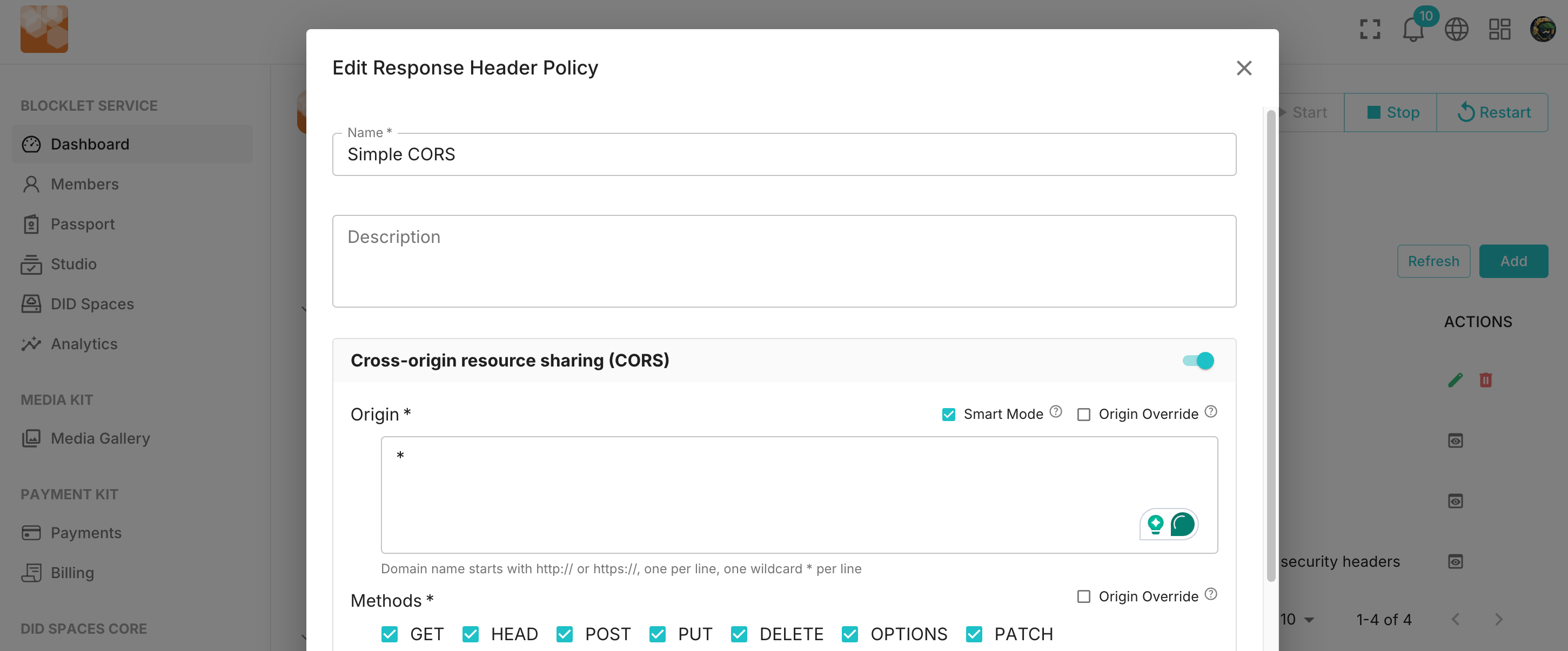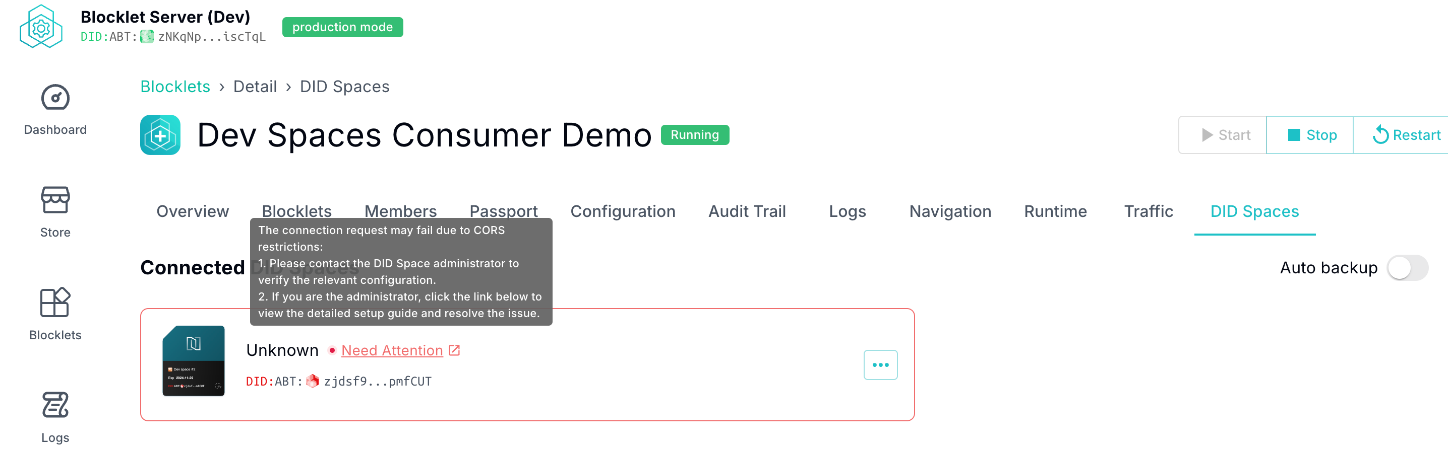 As shown above, the Origin only includes one address, and it’s not the Blocklet Server address used previously. Consequently, connections from the Blocklet Server to the DID Space will be blocked by CORS. We can add the Blocklet Server’s address to the Origin, or set the Origin to * (to allow any cross-origin requests):