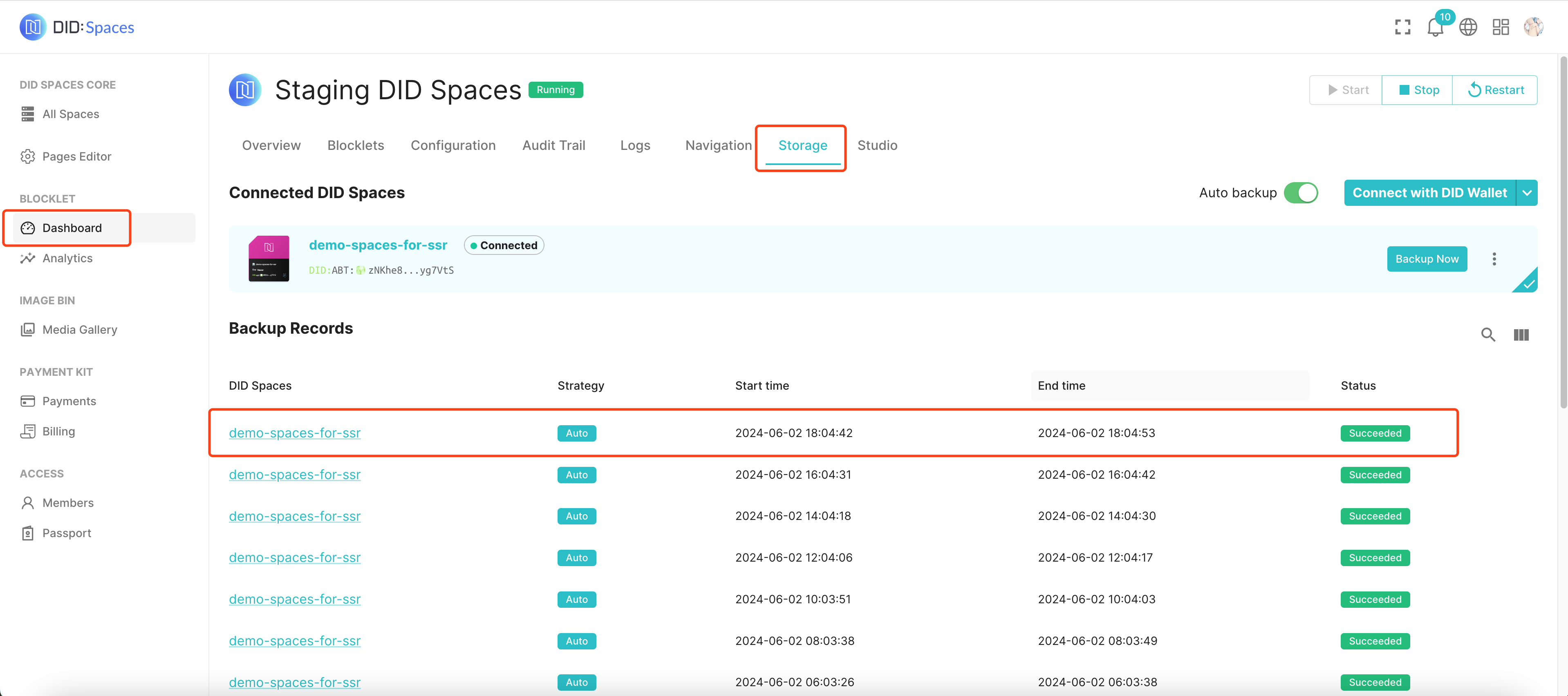 Return to the Blocklet's Storage page. After one minute, the automatic backup should be successfully triggered.