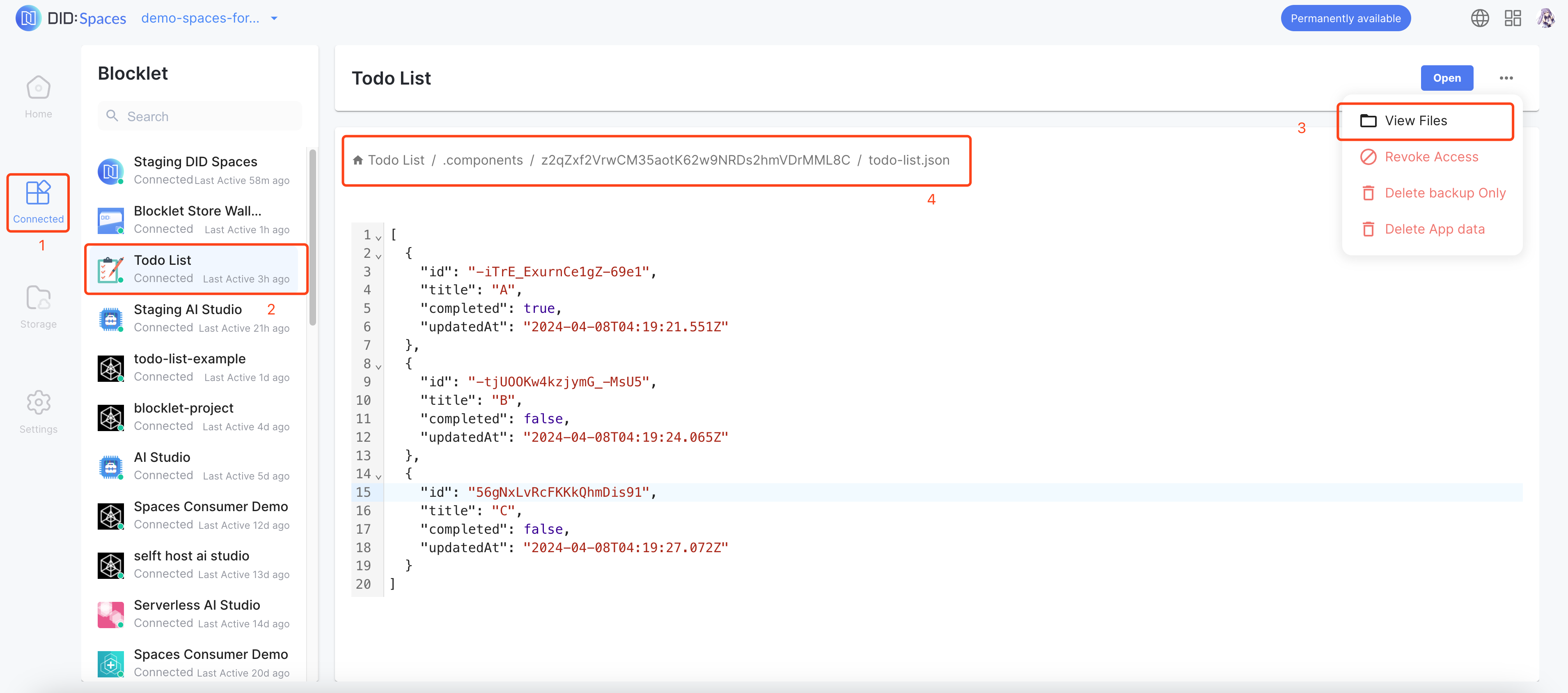 As you edit your Todo List, the data is automatically saved to your DID Space. Even if the page refreshes, the data is retained, and you can view the raw data stored in your DID Space.