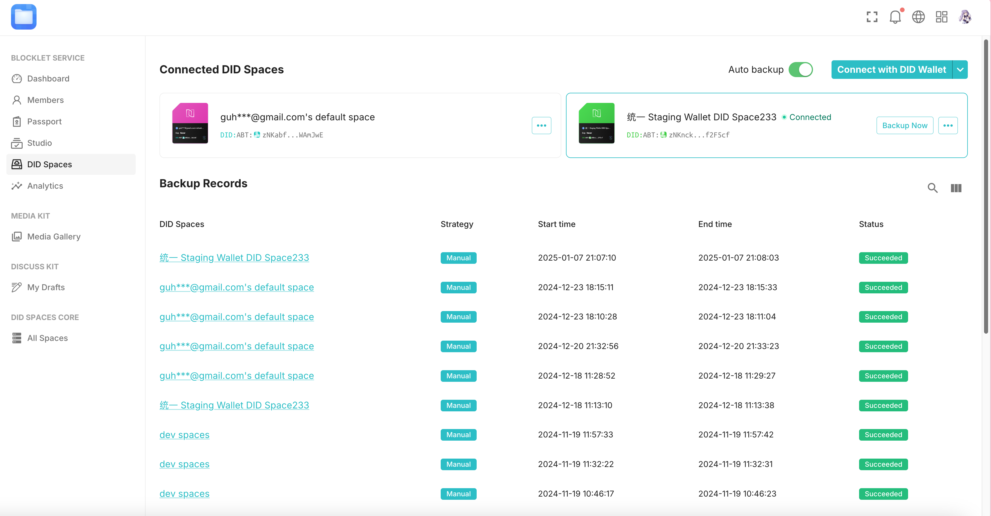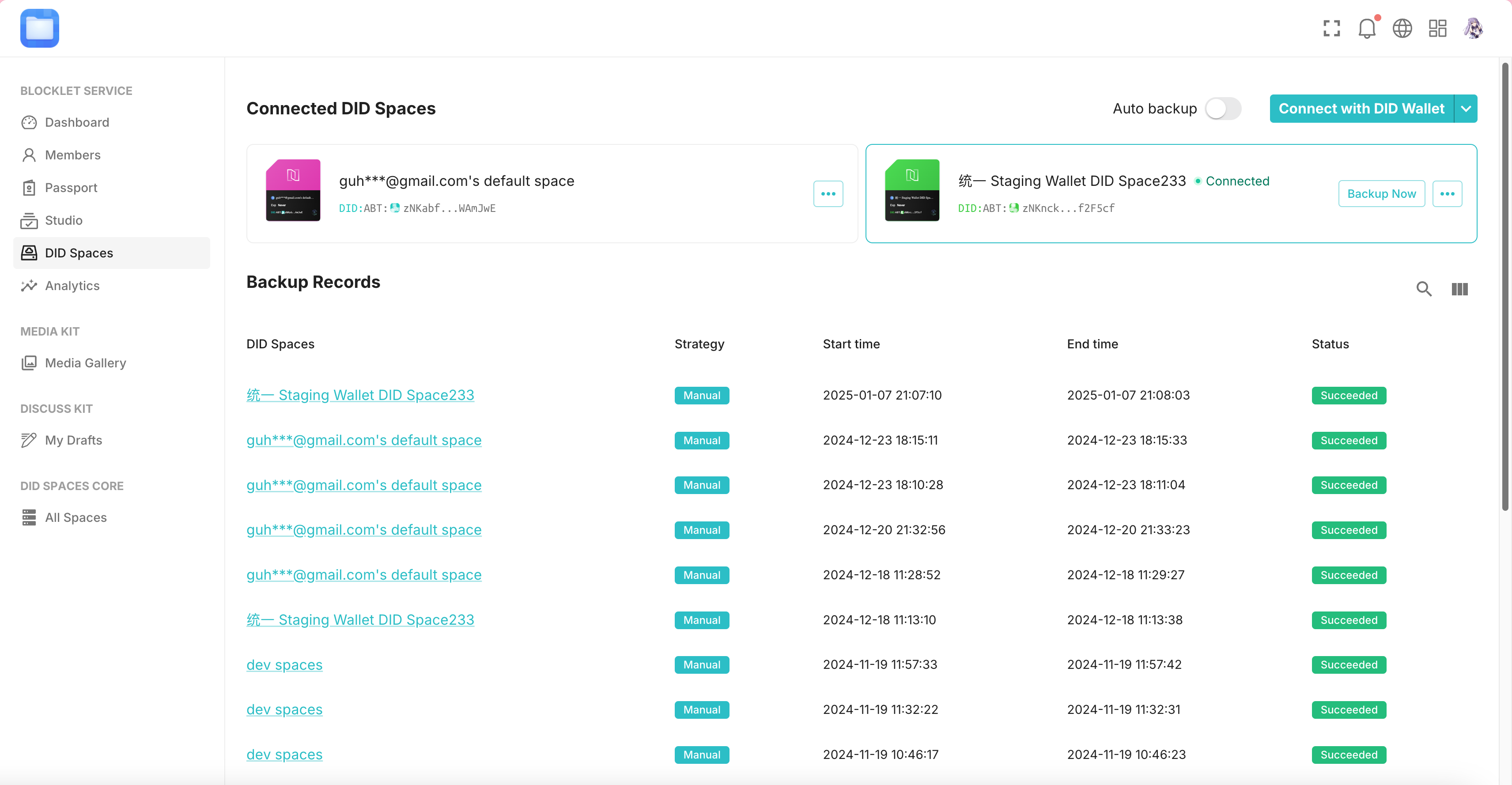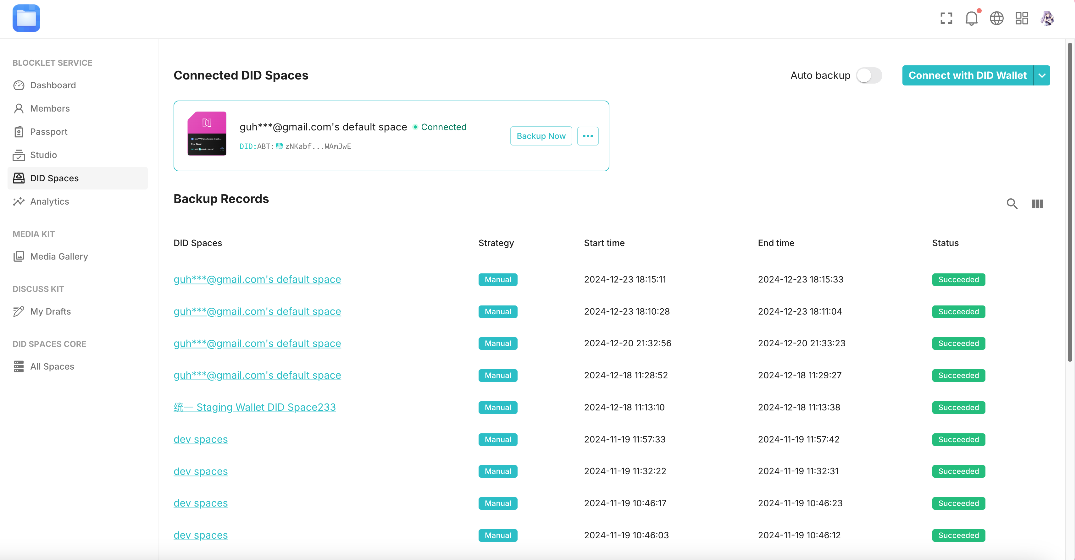 点击左侧的 Dashboard,再点击 DID Spaces 标签页,这里就是我们配置应用备份的界面了: