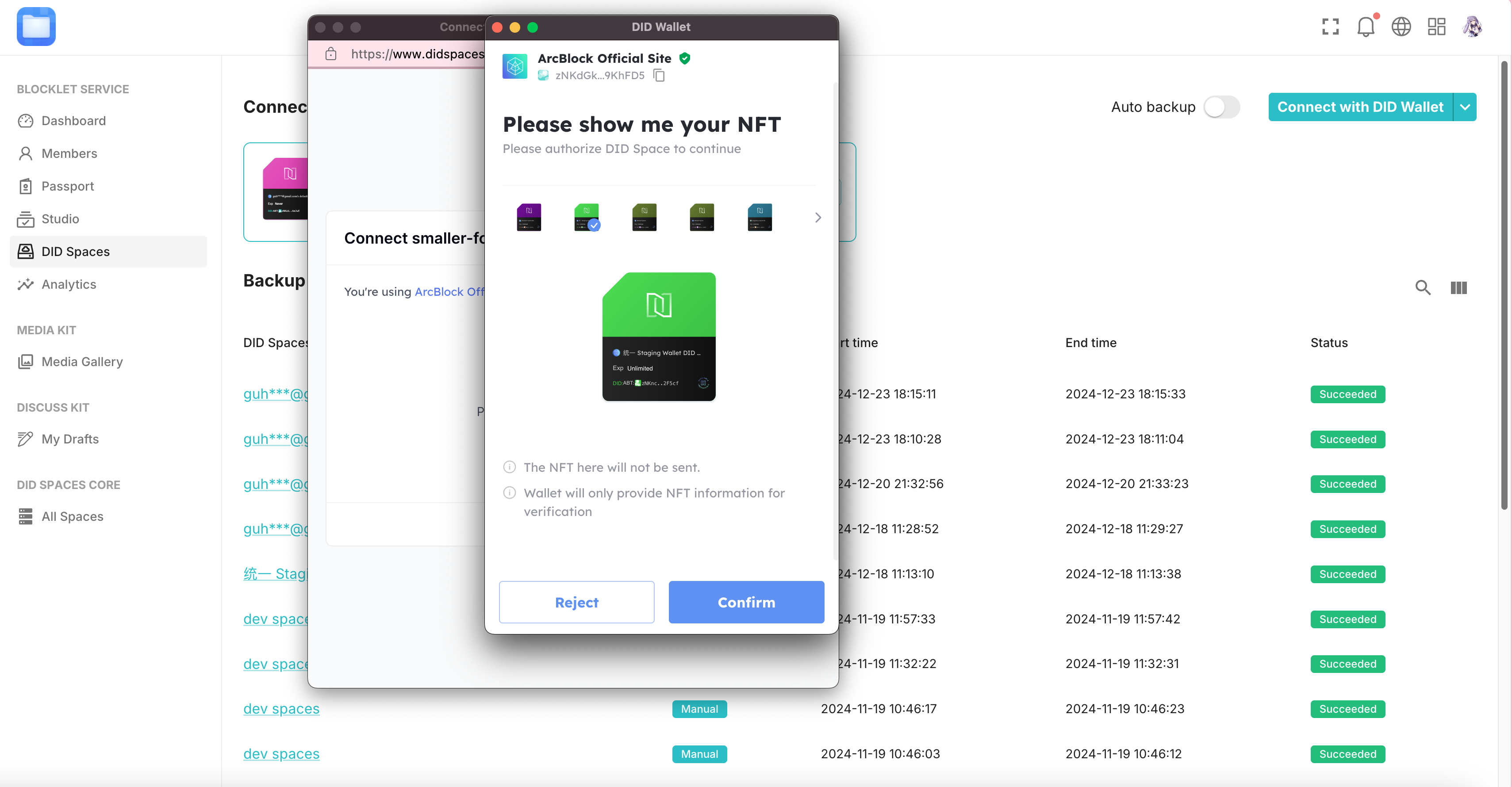 点击右上角的 Connect with DID Wallet 按钮,连接你的 DID Space,点击确认即可完成授权: