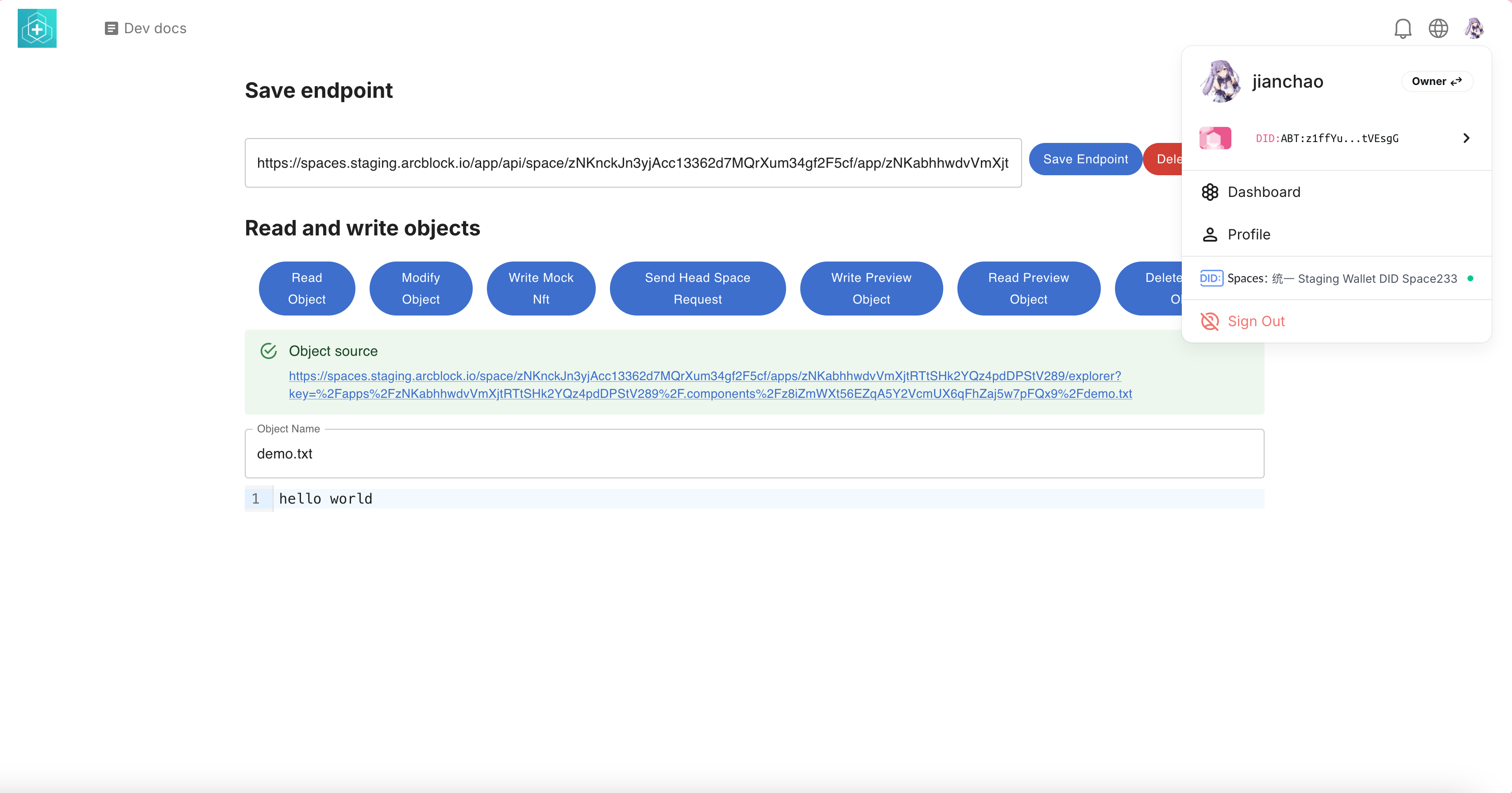 // 输出形如: https://space.team.arcblock.io/app/api/space/zNKhe8jwgNZX2z7ZUfwNddNECxSe3wyg7VtS/app/zNKfEK9actwBeLhfVvc9U1p1CqVWxtivVxo6/object/在获得 DID Space endpoint 之后,你的应用将可以在这个 DID Space 上进行数据的读写,可参考: Using @blocklet/did-space-js to read and write DID Space.