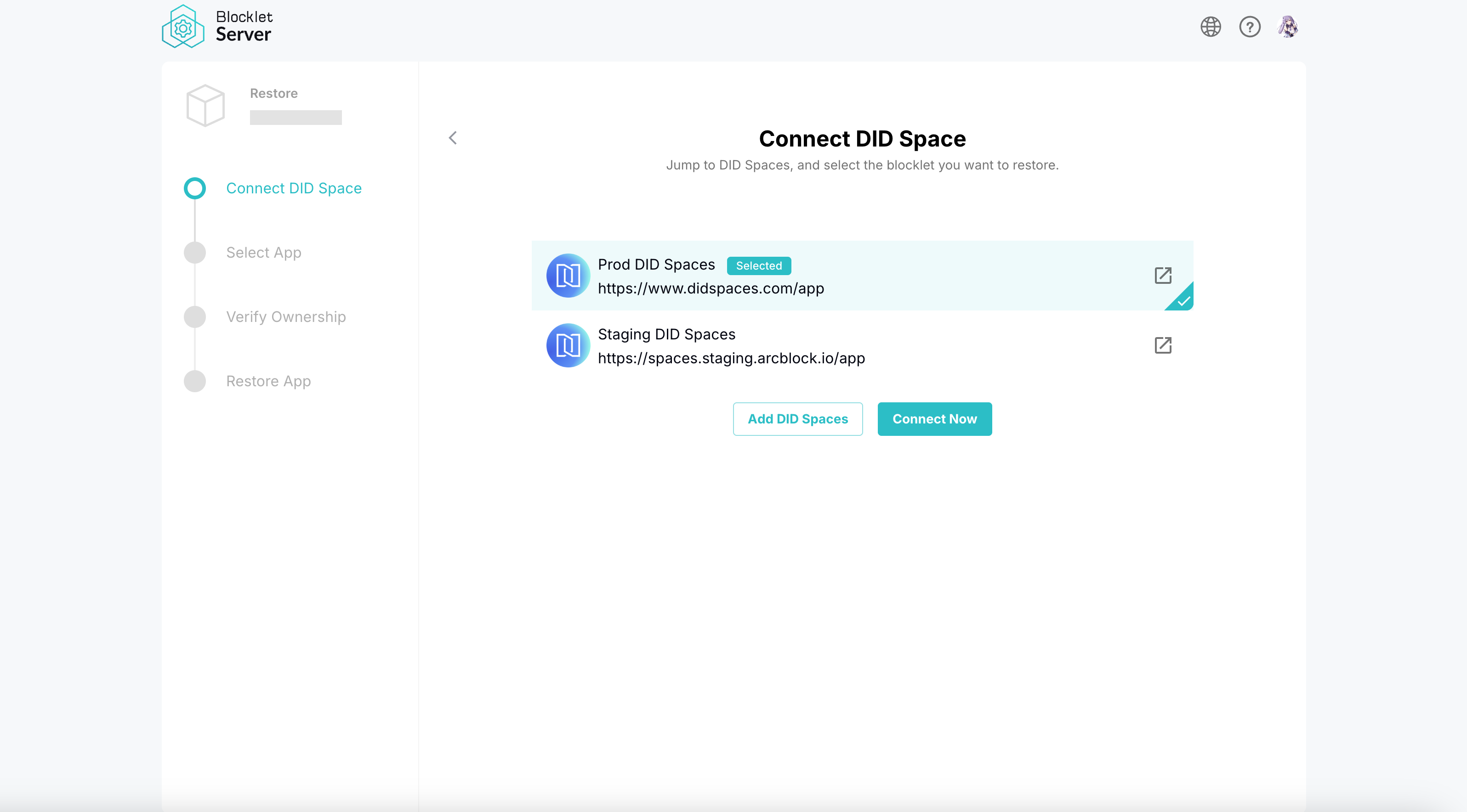 选择你的 DID Spaces 服务站点(你要还原的应用应该存在于这个 DID Spaces 站点中),点击 Connect Now,以连接到 DID Spaces: