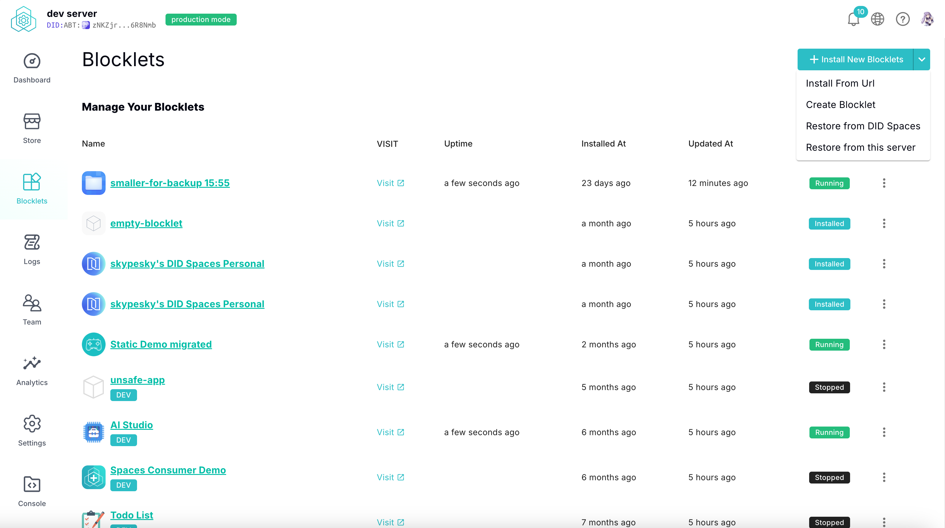 如果您有自己的 Blocklet Server,您可以把已经备份到 DID Spaces 的应用还原到 Blocklet Server。