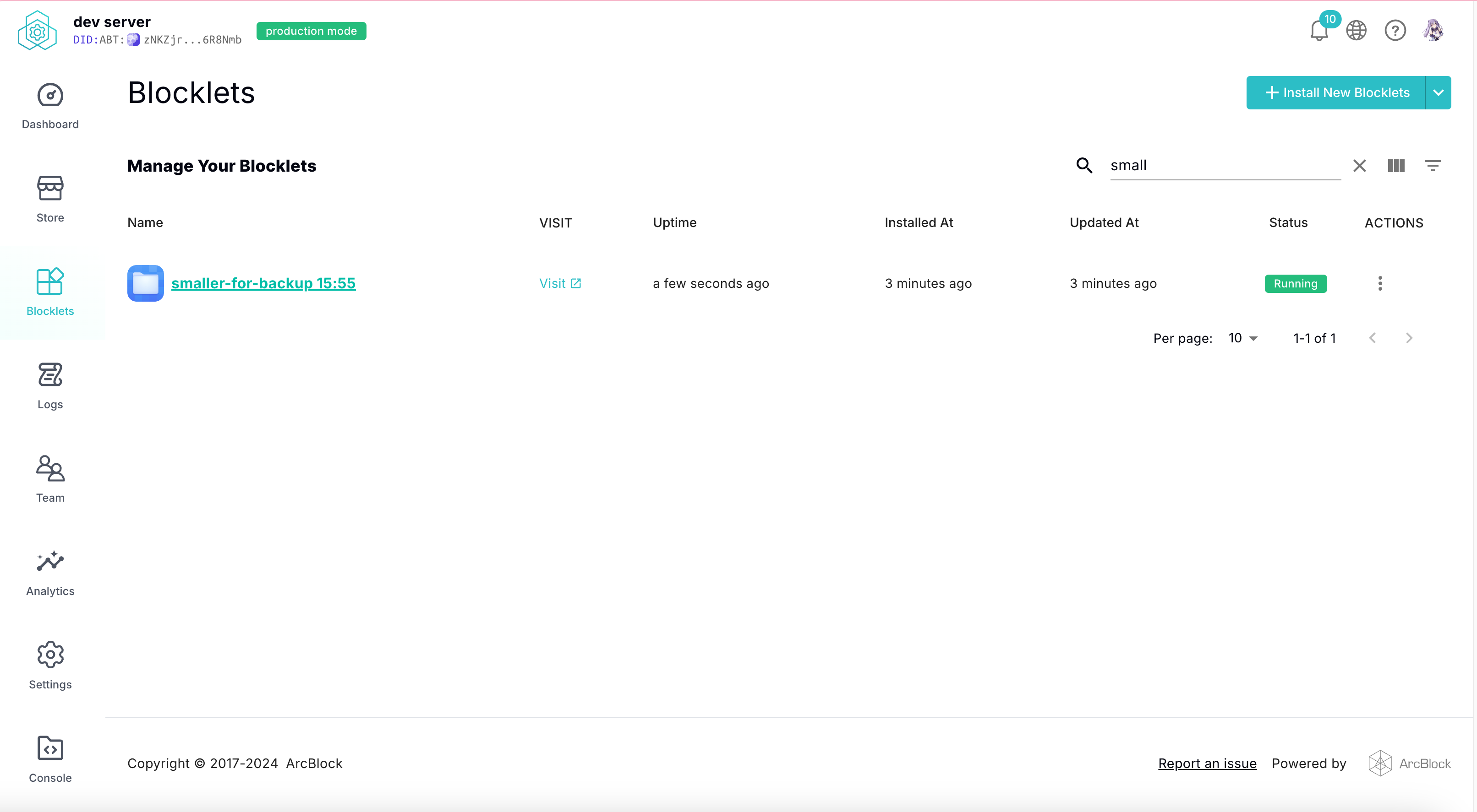 授权成功之后,应用将开始还原到您的 Blocklet Server。在等待片刻之后,应用还原成功,你将在 Blocklet Server 的 blocklets 页面可以看到它: