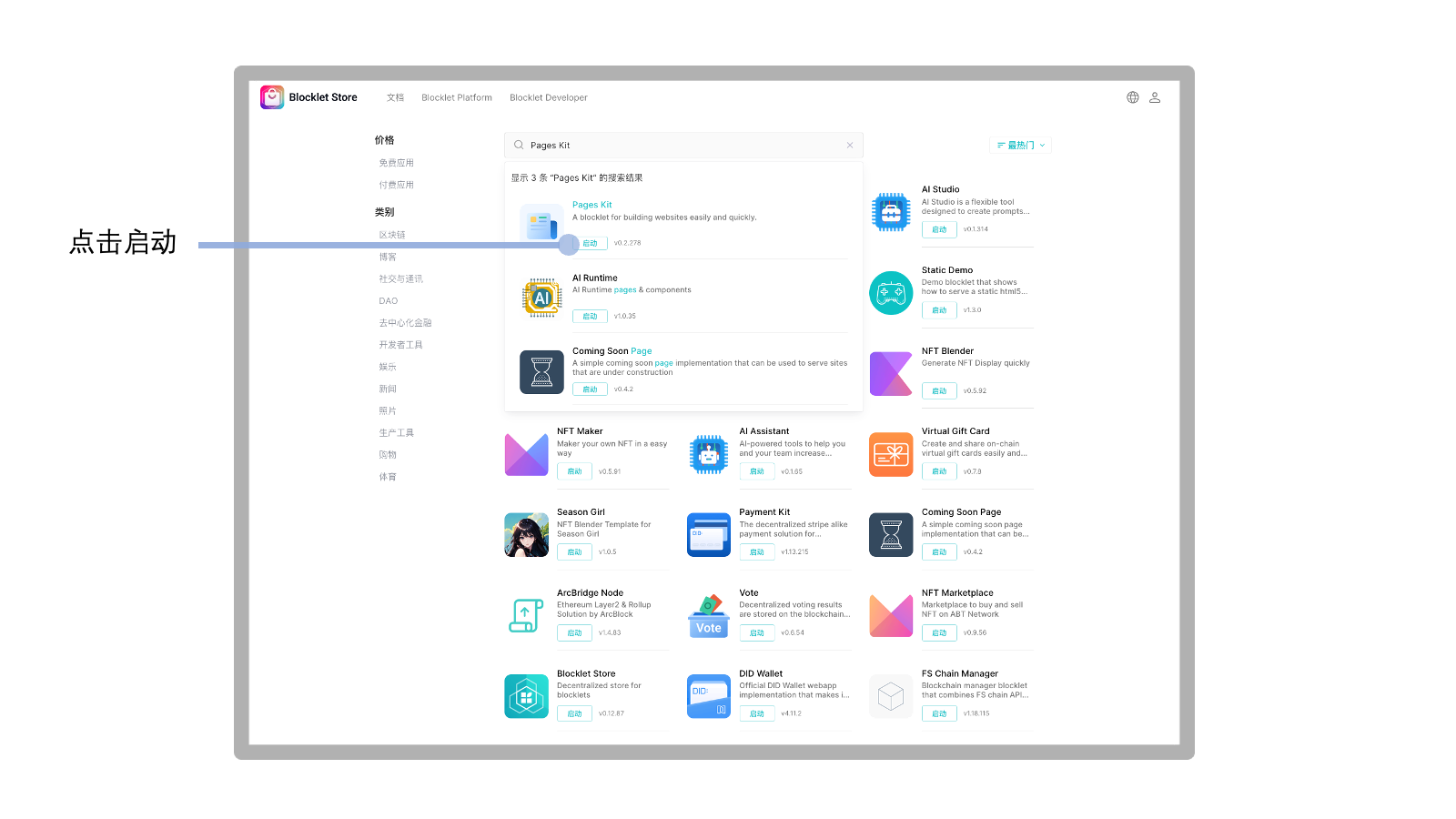 在 https://store.blocklet.dev/ 中选择准备安装的 Blocklet, 点击启动按钮。