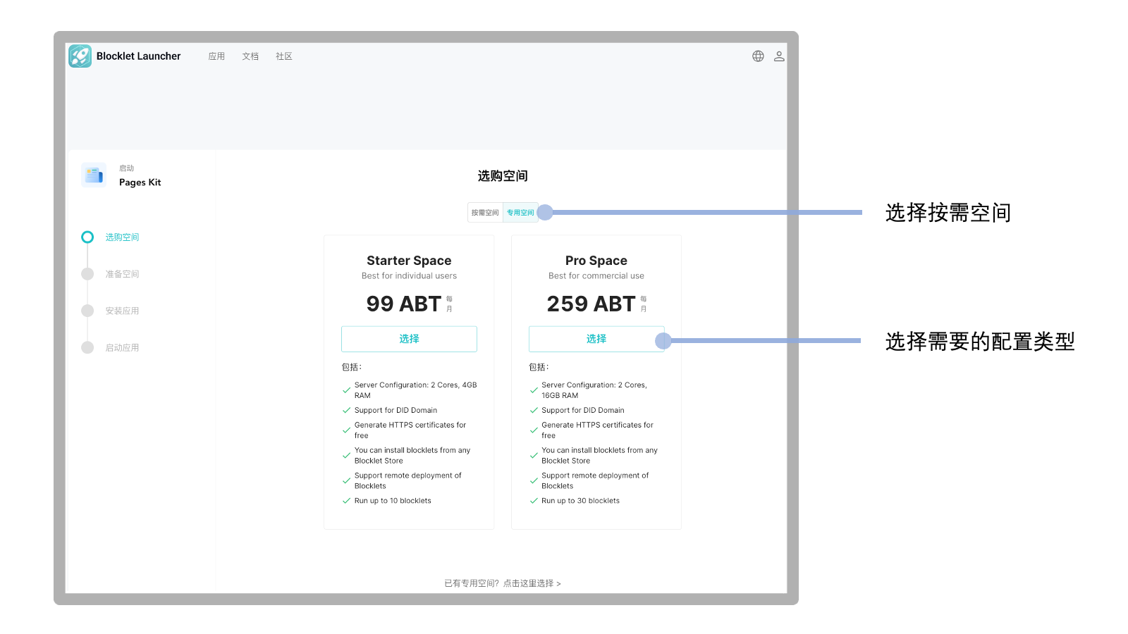 - 选择需要的配置类型;目前提供了 Starter Space 和 Pro Space 两种配置,各自有适合的使用场景: