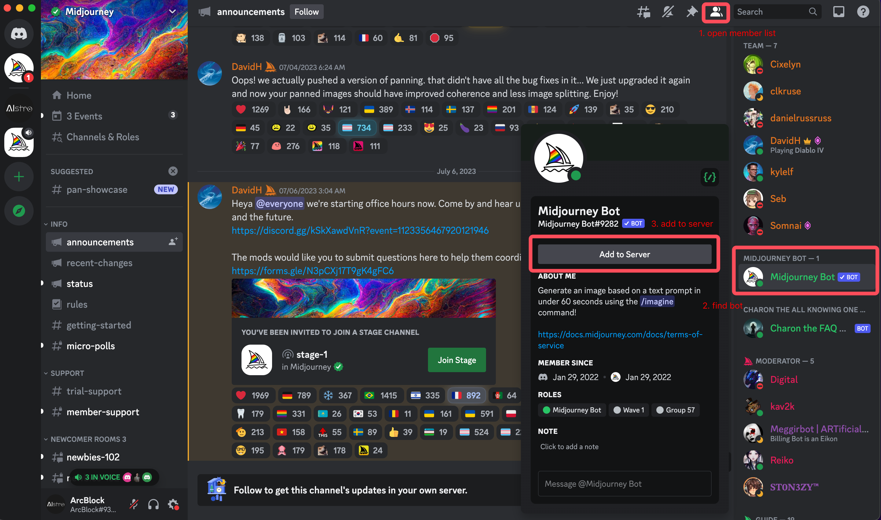 At this point it will jump to Discord, and open the Midjourney community, we click Member List, find the robot, right-click to join our own server