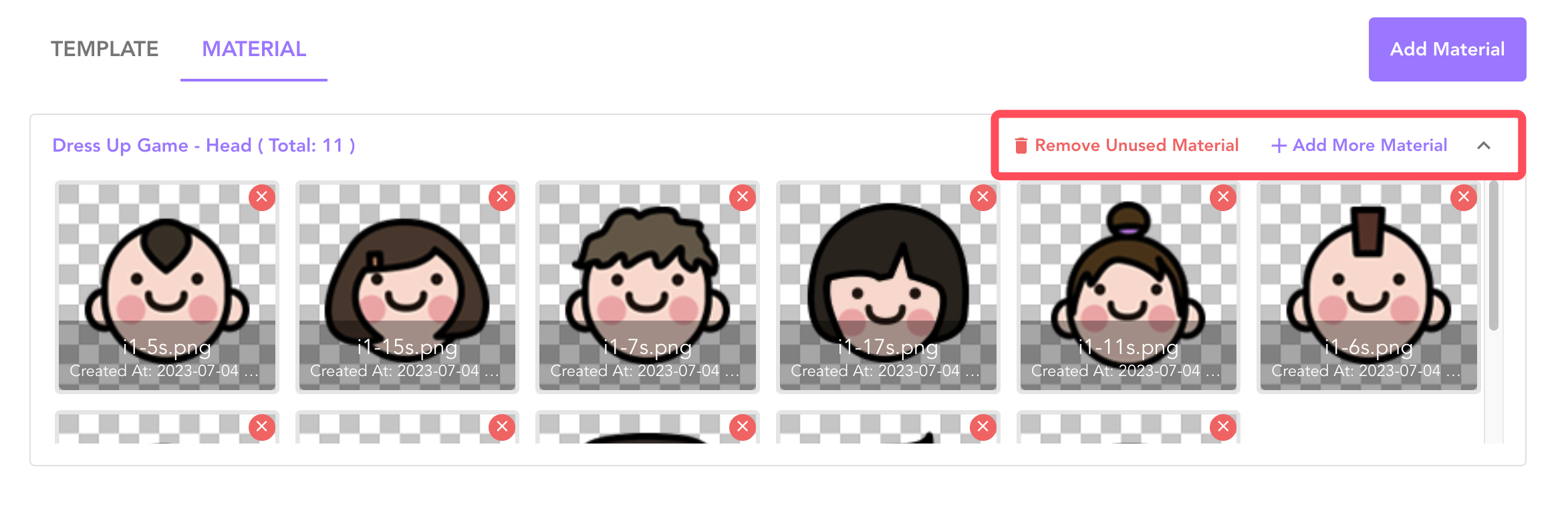 * 建议将相同部位的素材,导出相同尺寸的图片,再上传到 素材管理
