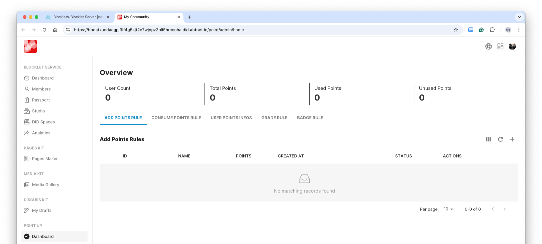打开 Point Up 的管理控制台,切换到 “赚取积分规则” Tab,然后点击页面的添加按钮开始添加第一条赚取积分的规则
