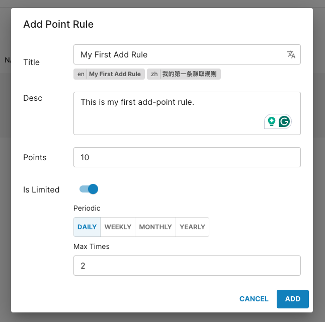 比如,下面的示例中,我设置了每个用户一天最多可以触发该规则领取积分两次。