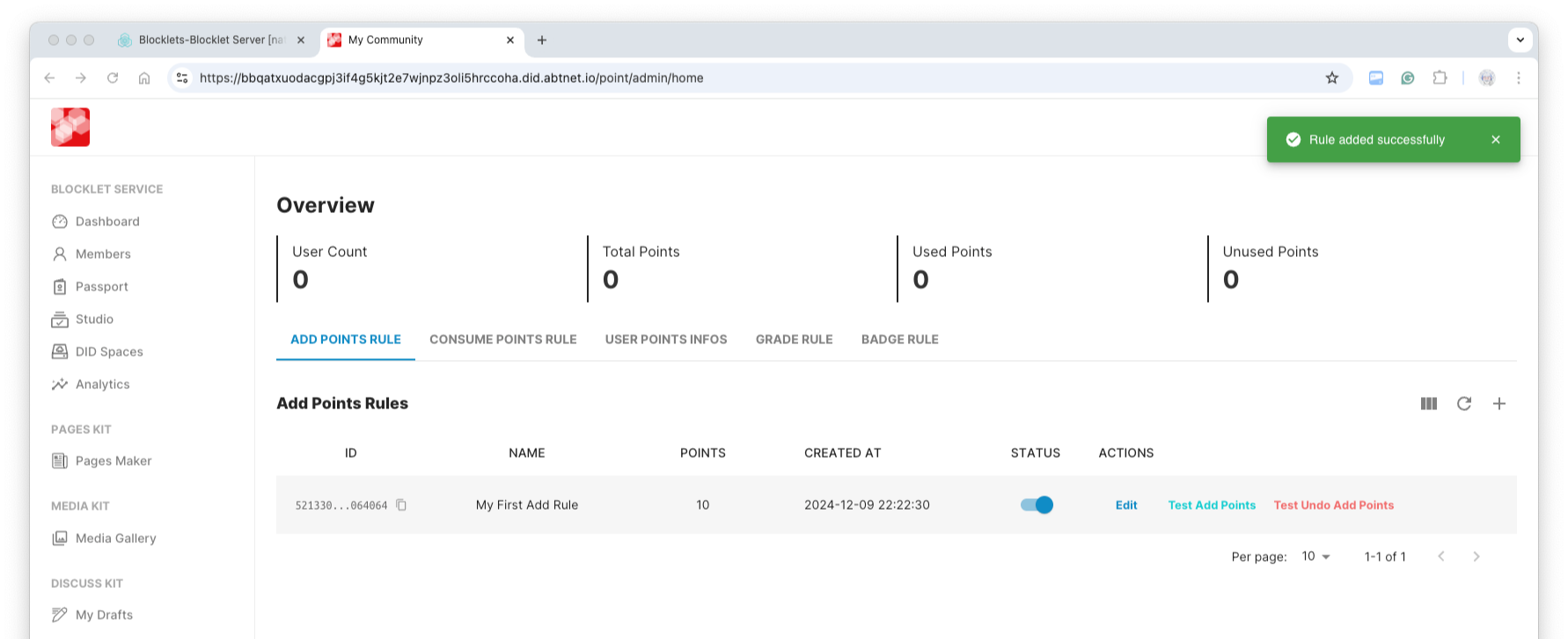 此时,我们可以点击测试按钮测试积分功能是否正常