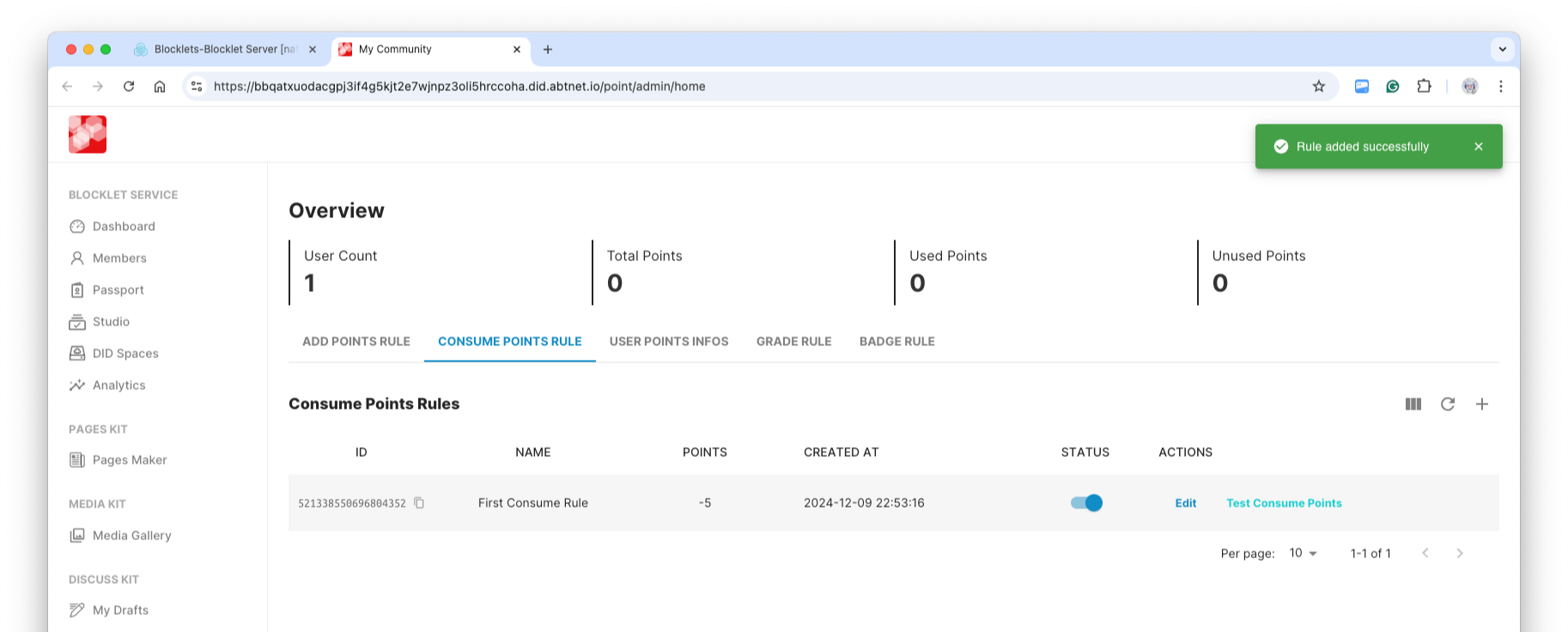 此时,我们可以点击测试按钮测试积分使用功能是否正常