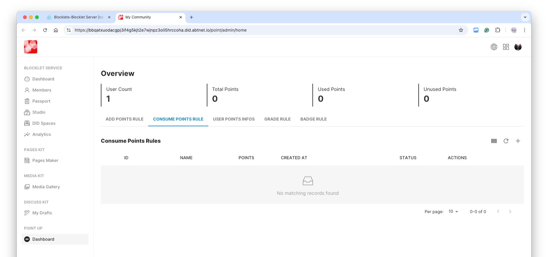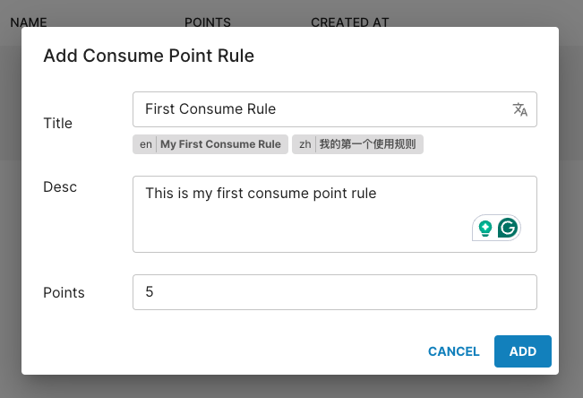 打开 Point Up 的管理控制台,切换到 “使用积分规则” Tab,然后点击页面的添加按钮开始添加第一条使用积分的规则