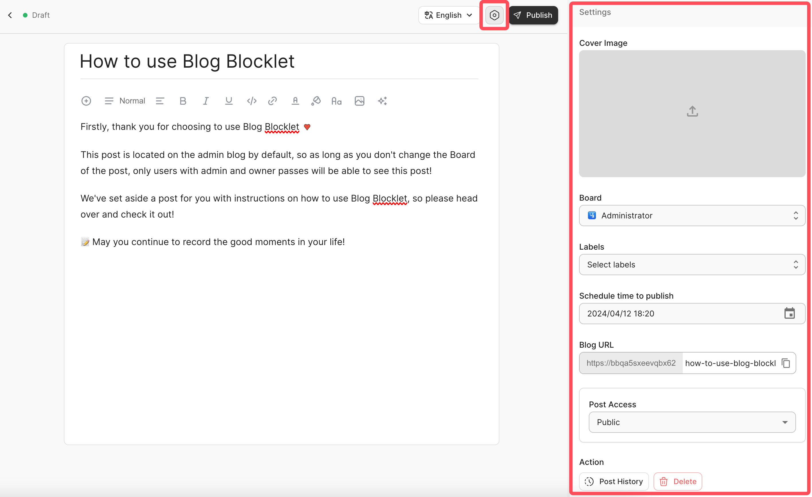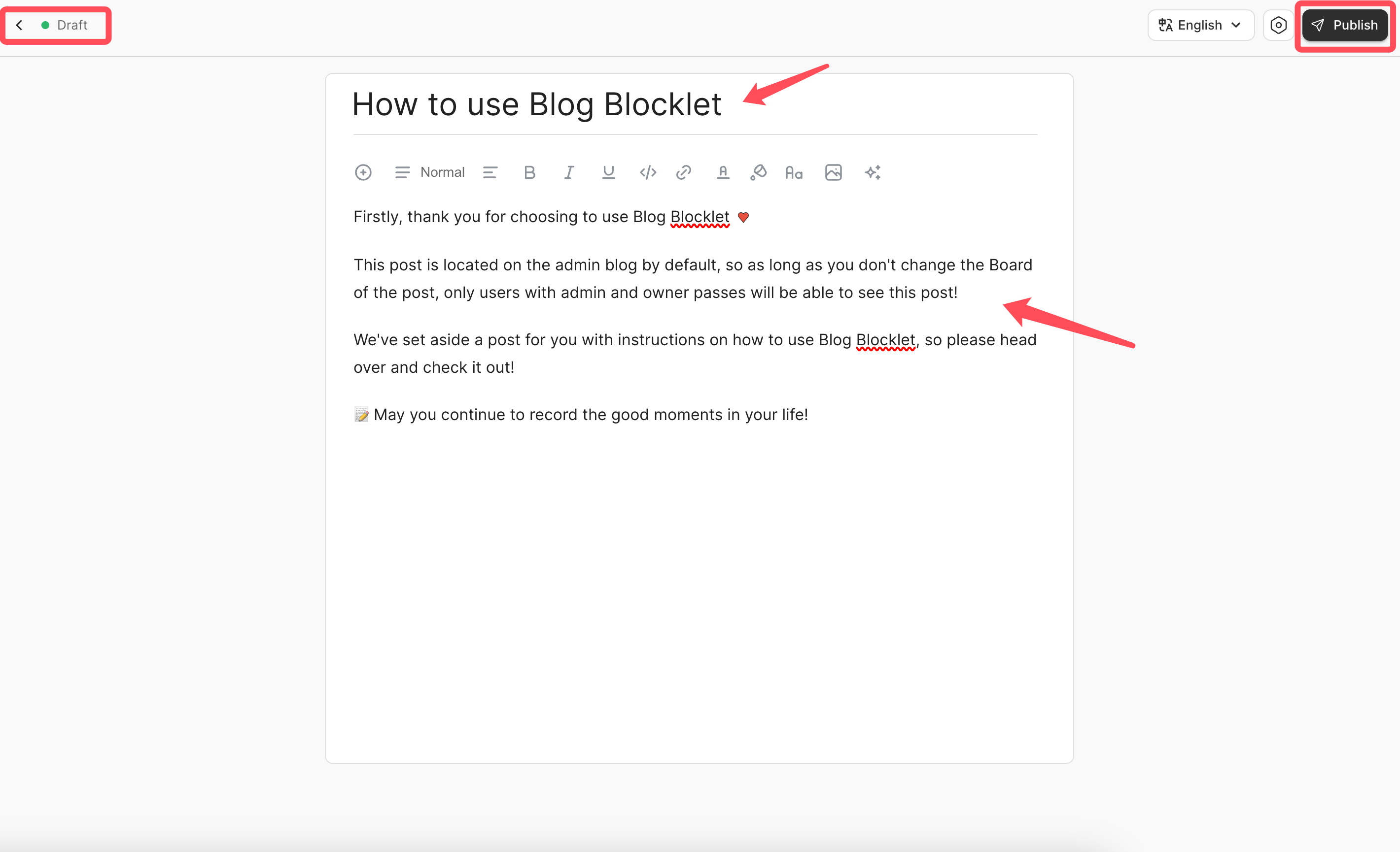 值得注意的是左上角的 Draft 状态,表示当前的修改并未发布,目前只有管理员和自己可以看到这篇 Blog,如果需要发布,请点击右上角的 Publish 按钮