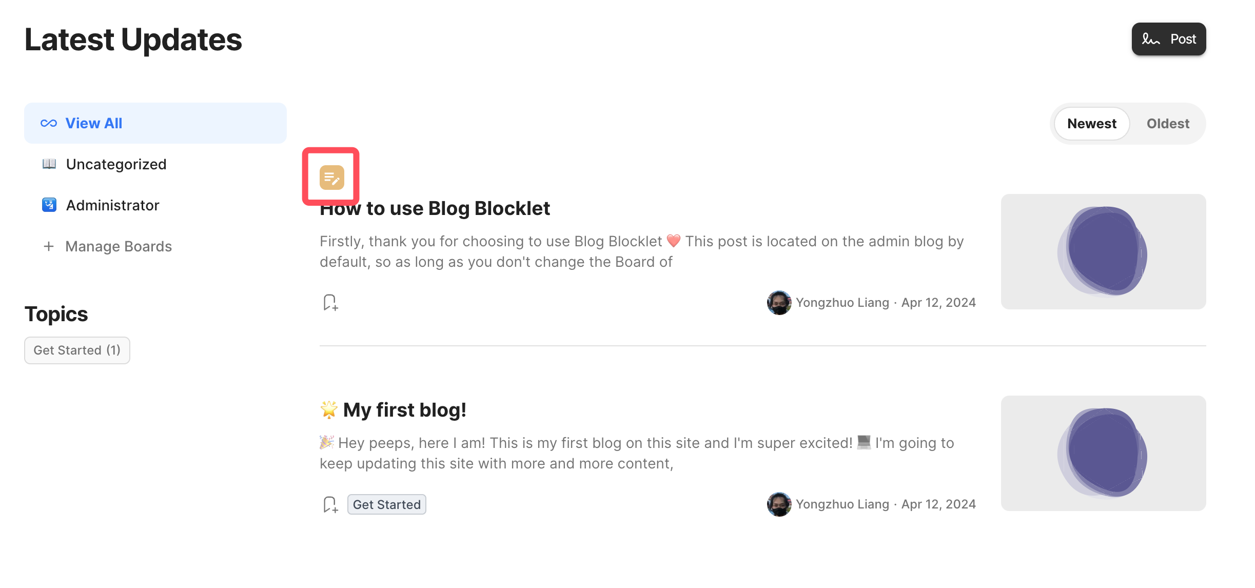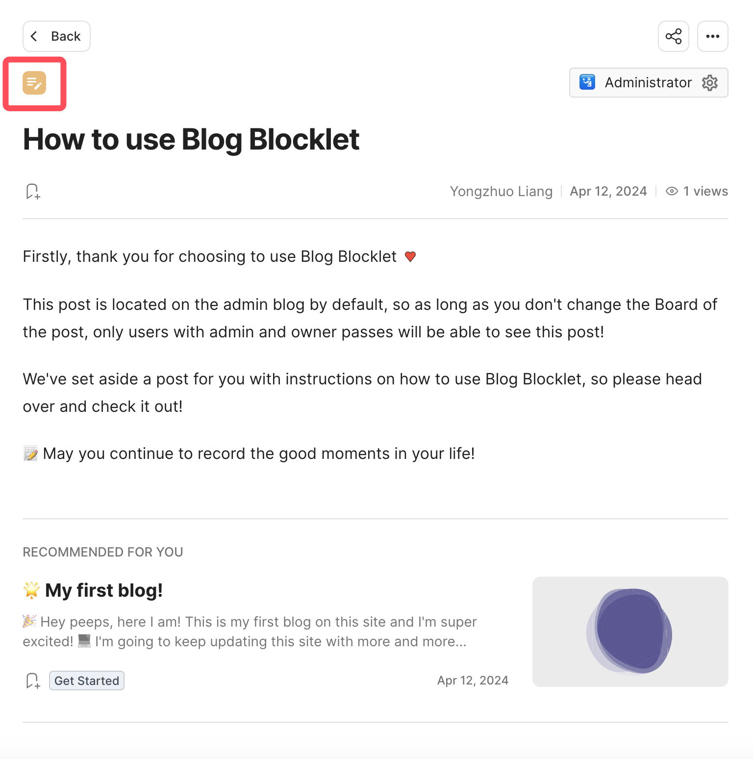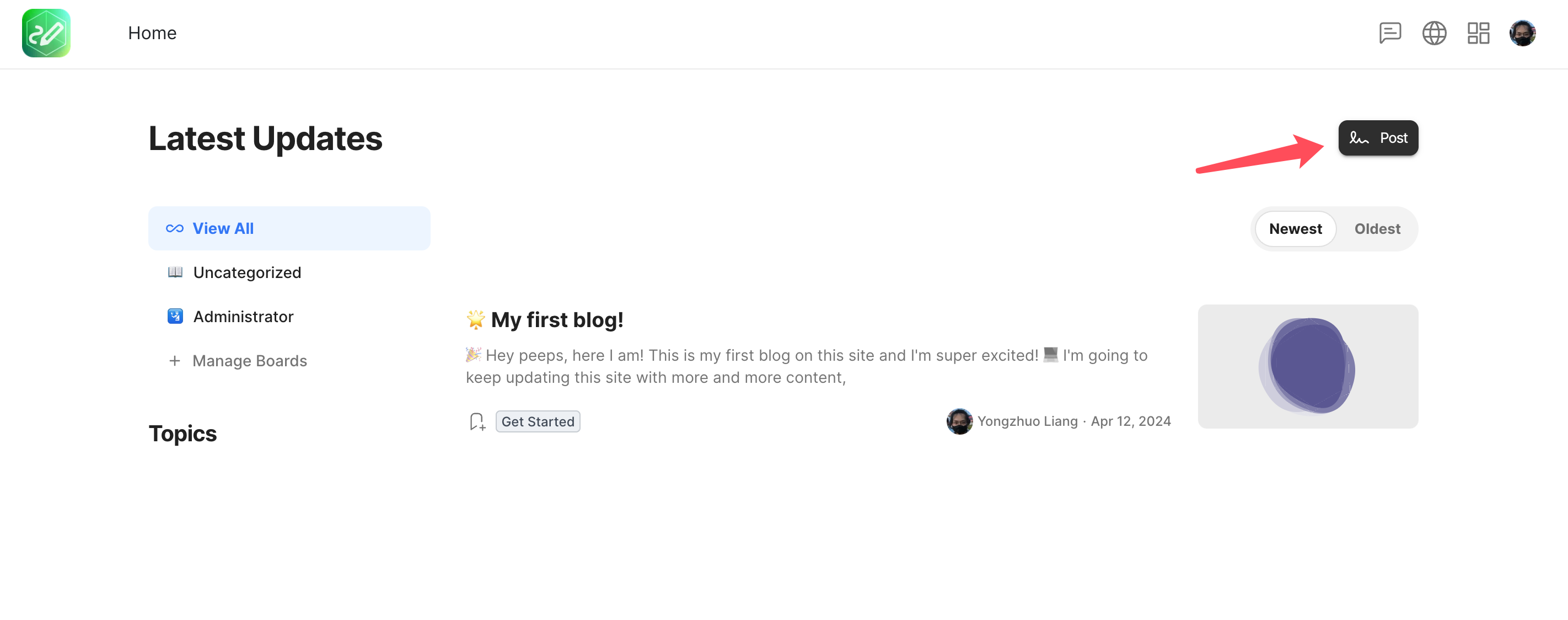 首先我们打开 Blog 模块,点击 Post 按钮,它会前往一个沉浸式页面,让你可以专注写 Blog